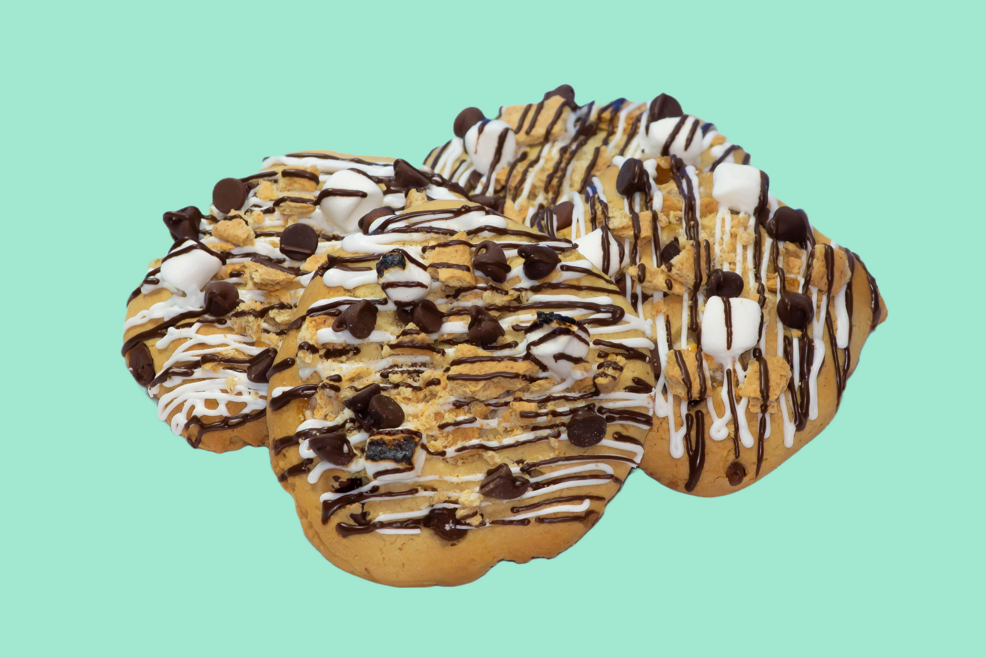 " Campfire Delight "- A delicious soft cookie with milk chocolate chips baked with marshmallows and graham cookies in the mix! Topped with white chocolate drizzle, milk chocolate drizzle, marshmallows, graham cookies and chocolate chips.