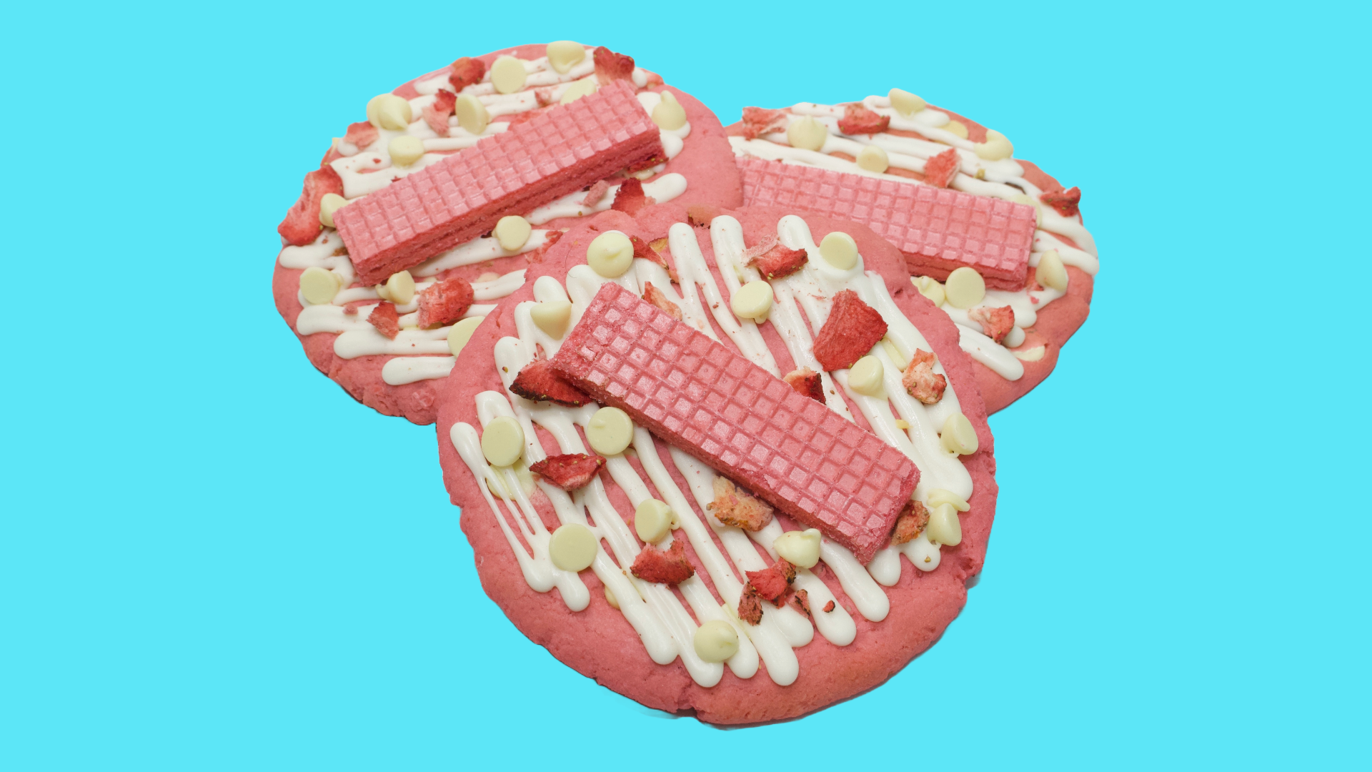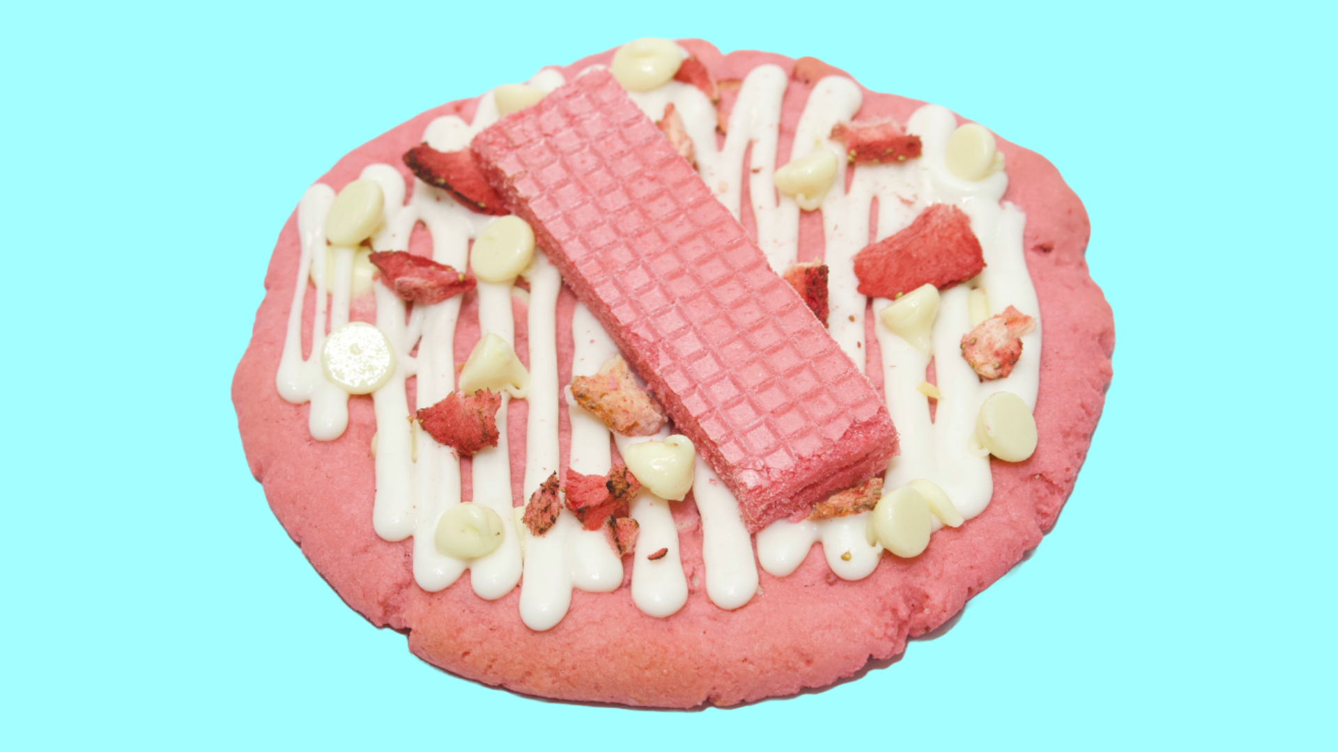 " Disque Manager "- A delicious strawberry soft cookie baked with white chocolate chips and freeze dried strawberries! Topped with white chocolate drizzle, white chocolate chips, freeze dried strawberries and a strawberry wafer cookie.