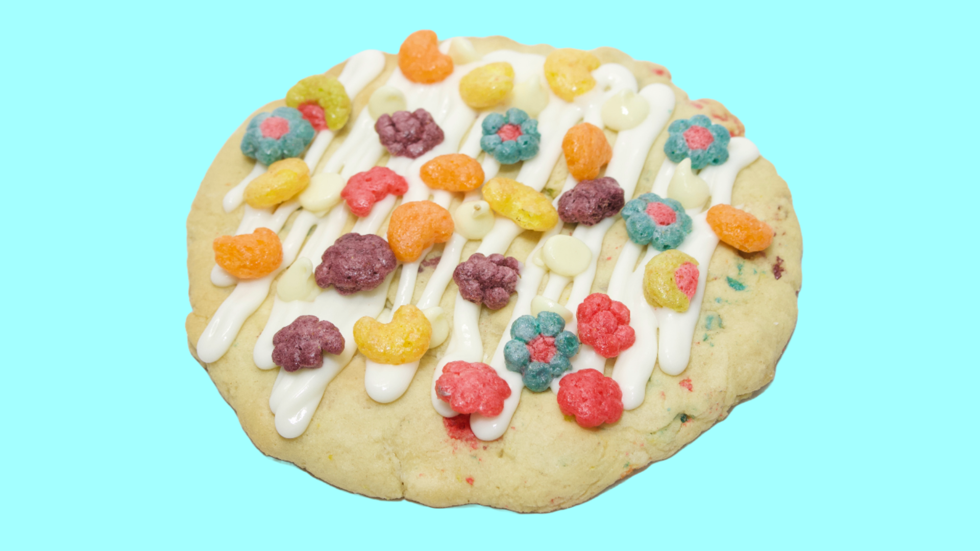 " Drama "- A delicious soft cookie baked with white chocolate chips and Trix cereal in the mix. Topped with white chocolate chips, white chocolate drizzle and Trix cereal.