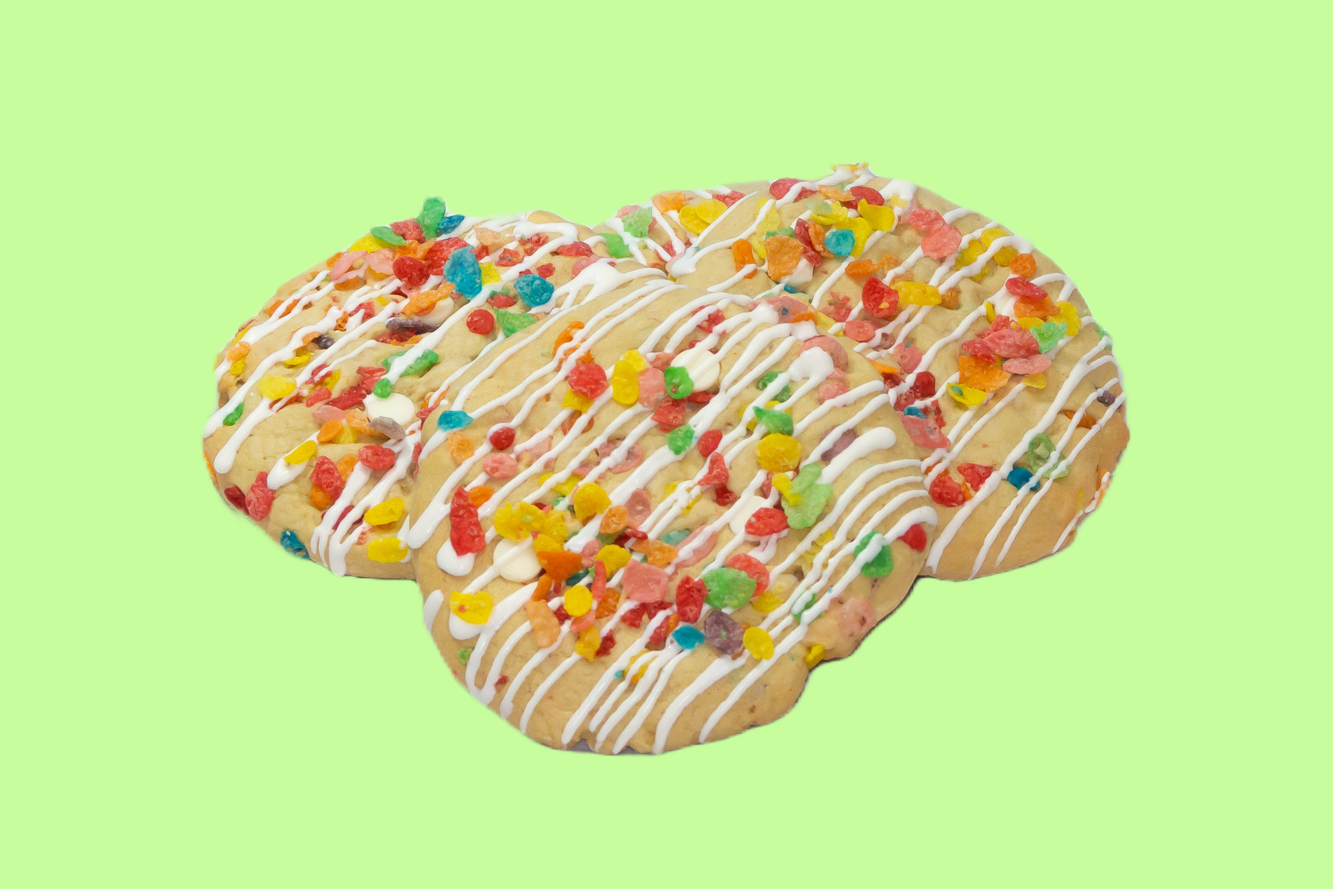 "Fruitylicious"- A delicious soft cookie with White Chocolate chips baked with Fruity Pebbles cereal in the mix! Topped with Fruity Pebbles and drizzled with white chocolate.