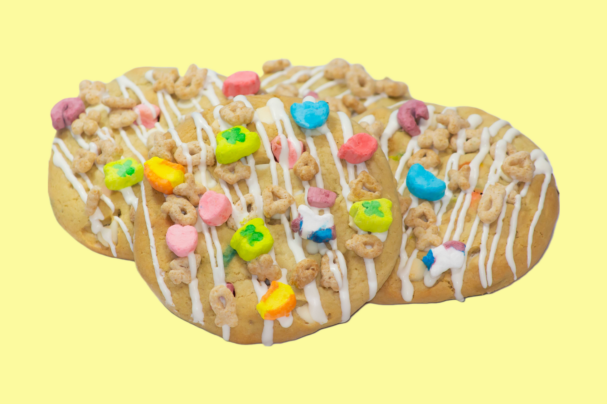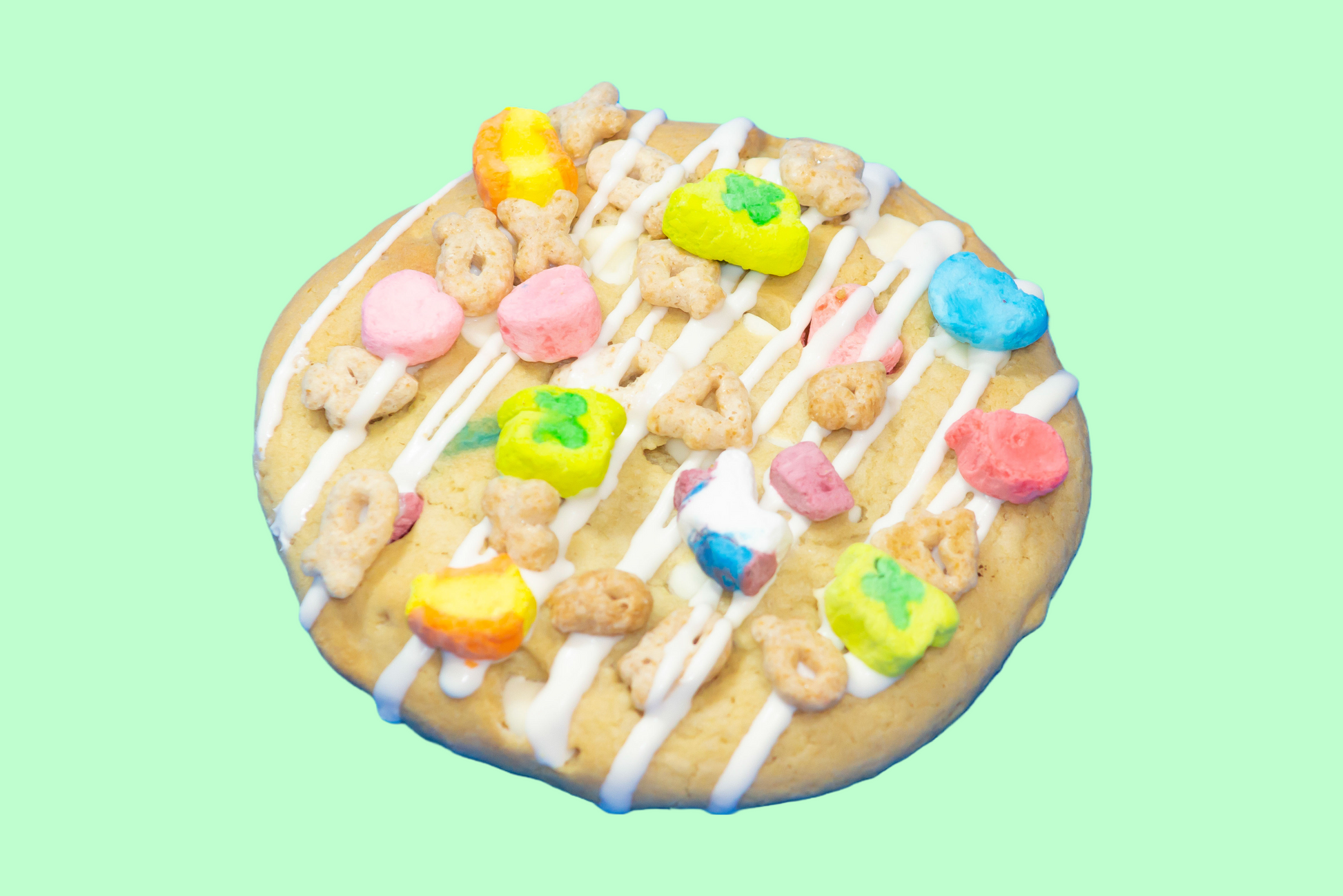 "La Buena Suerte"- A delicious soft cookie with White Chocolate chips baked with Lucky charms cereal in the mix! Topped with Lucky Charms Cereal and drizzled with white chocolate.