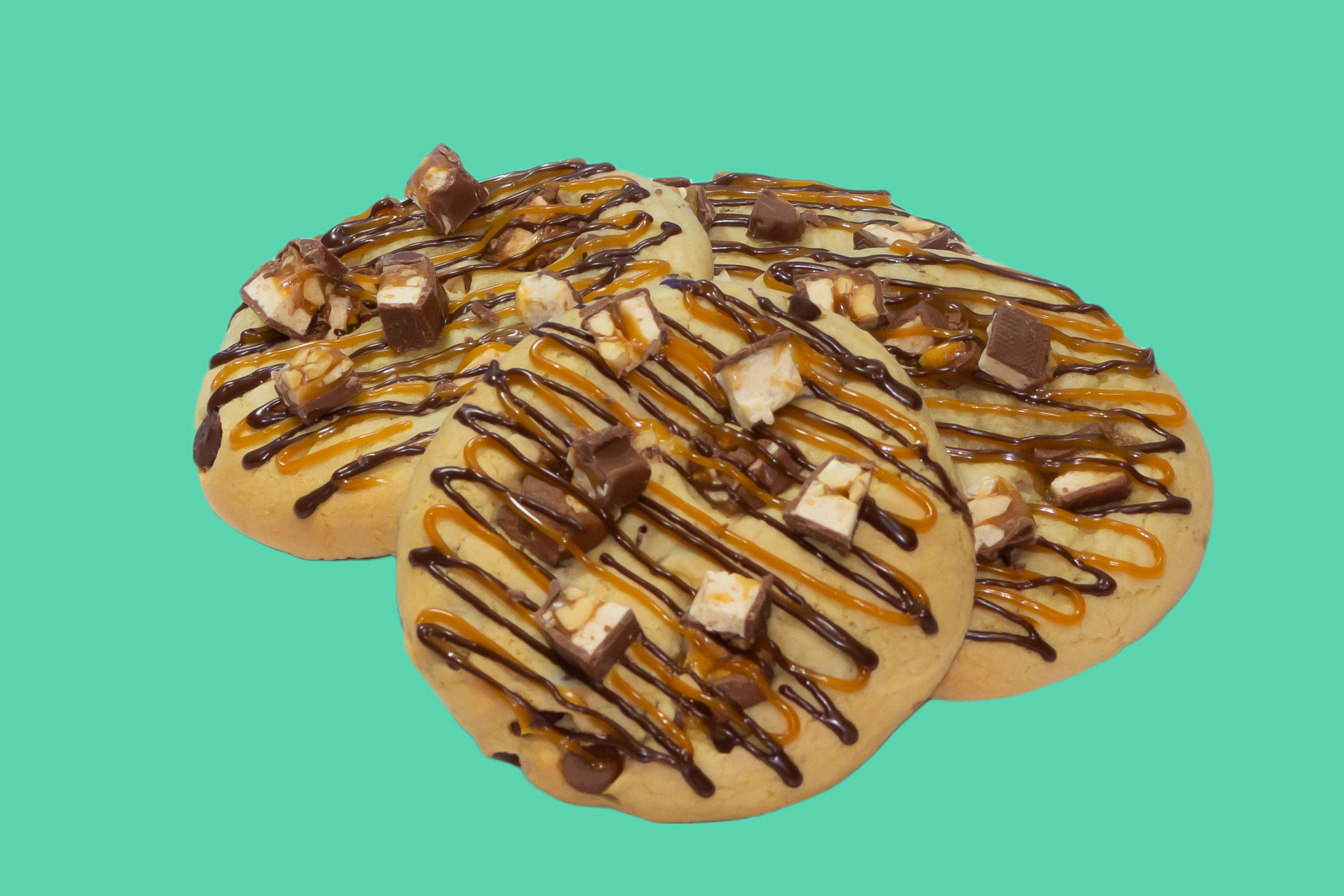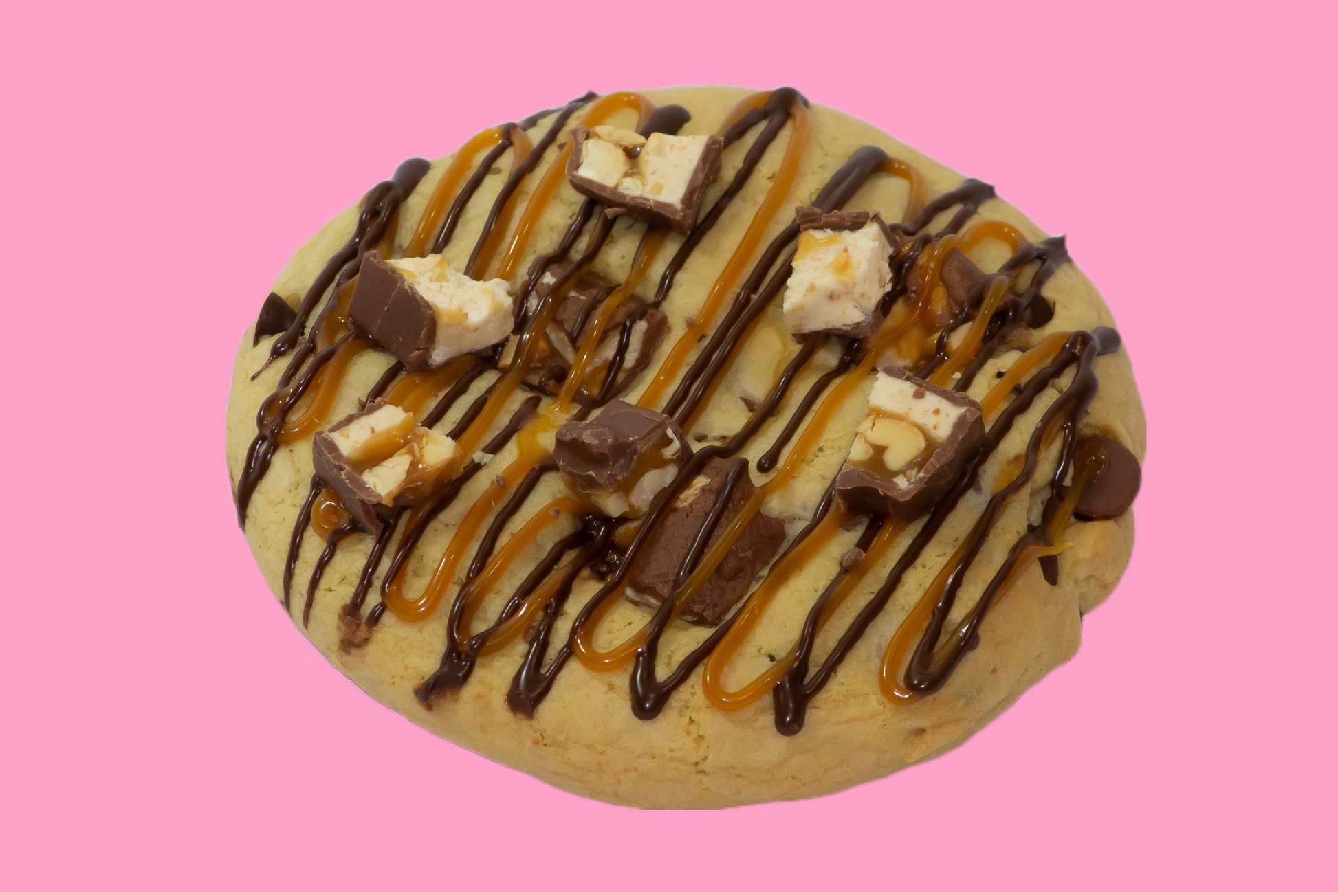 " Ready.. Set.. Snickers! "- A delicious soft cookie with milk chocolate chips baked with Snickers chocolate in the mix! Topped with caramel drizzle, chocolate drizzle and Snicker chocolate pieces.