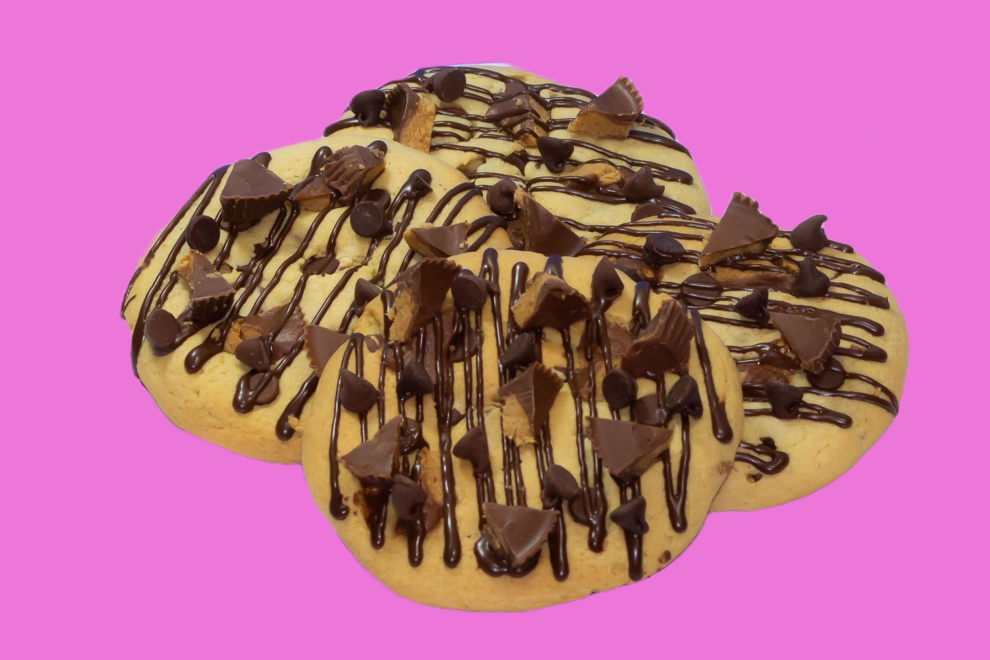 " Sorry Not Sorry "- A delicious soft cookie with milk chocolate chips baked with Reese's Peanut Butter Cups in the mix! Topped with chocolate drizzle and Reese's Peanut Butter Cups.
