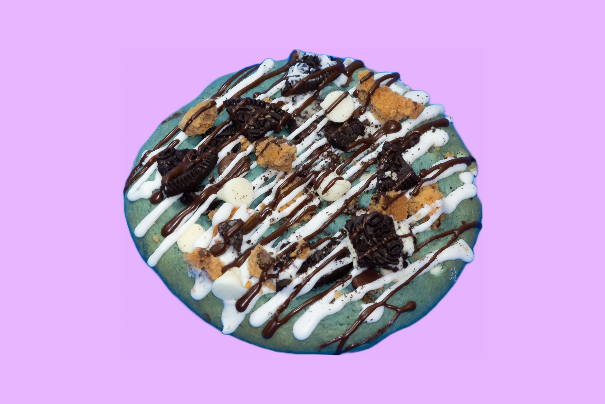 "The Monster"- A delicious soft cookie with white chocolate chips and milk chocolate chips baked with Oreos and Chips Ahoy in the mix! Topped with white chocolate chips, milk chocolate chips, Chips Ahoy and Oreos. Drizzled with white chocolate and milk chocolate.